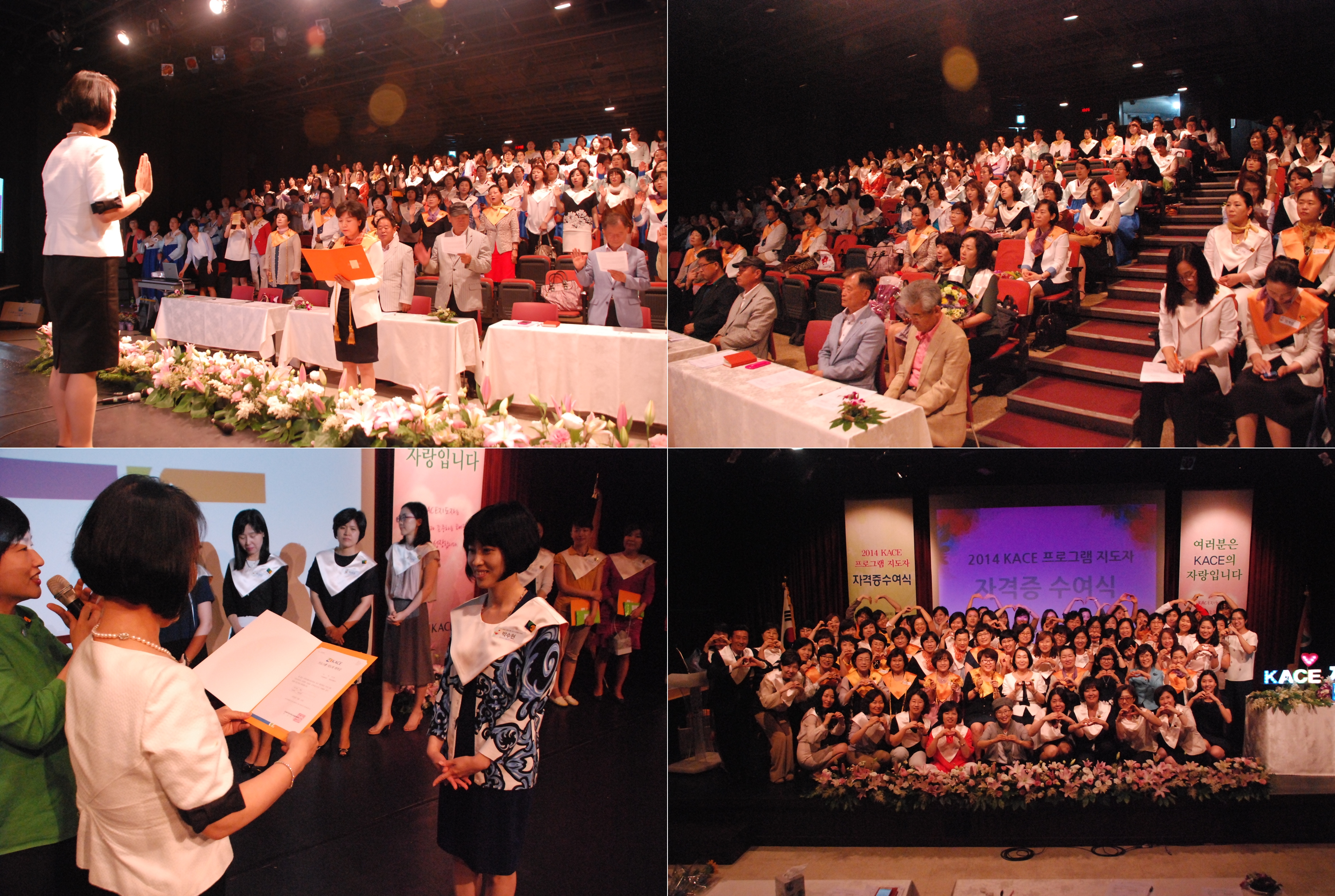 2014년 6월 19일 목요일 지역사회교육회관 새이웃 소극장에서 2014 KACE 전국프로그램 지도자 자격증 수여식이 열렸습니다. 이번 지도자 자격증 수여식은 전국에서 자격 수여대상자, 수상자, 축하객등 총 300여명이 참석했습니다. 오전과 오후로 나누어 진행된 이번 수여식을 통해 올해 500여명의 지도자가 새롭게 자격을 수여받거나 승급함으로써 전국에 6300여명의 KACE프로그램 지도자가 활동하게 됩니다.