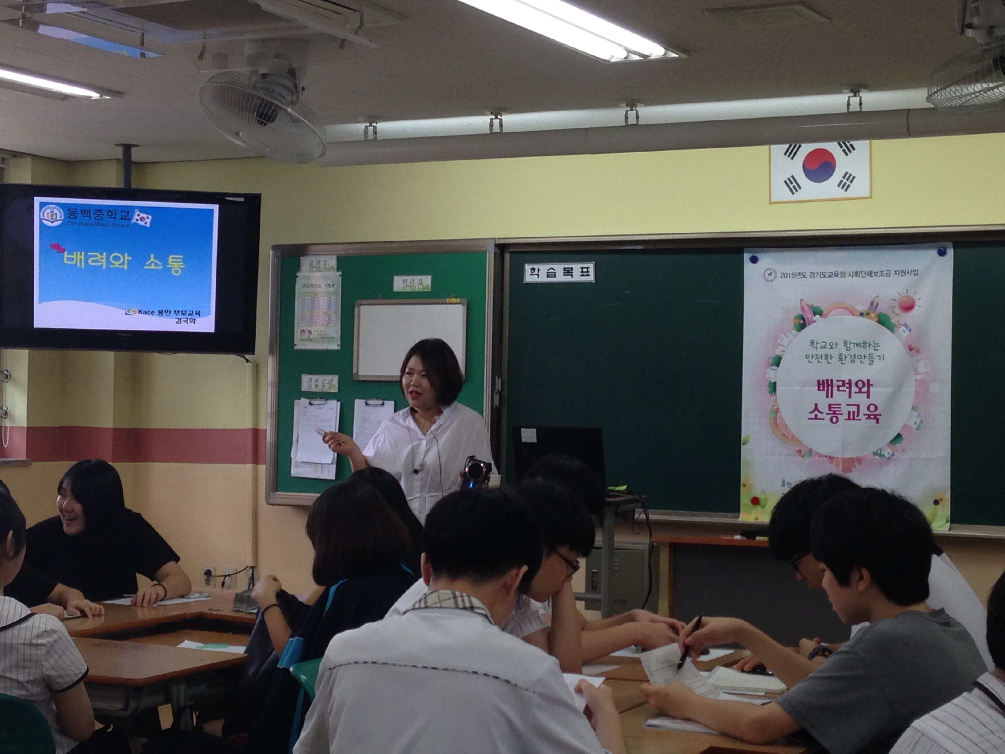 7월 15일 경기도 여성발전기금으로 진행된 배려와 소통교육이 동백중에서 3학년 5학급 학생들을 대상으로 진행되었습니다.