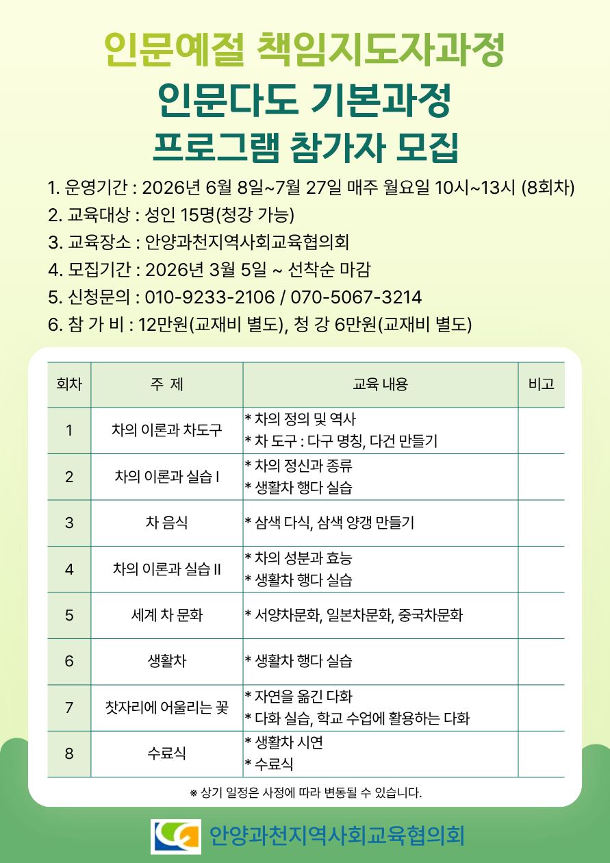 2) 인문다도 기본과정 : 2026년 6월 8일(월) ~ 2026년 7월 27일(월) 10시~13시 (8회차)