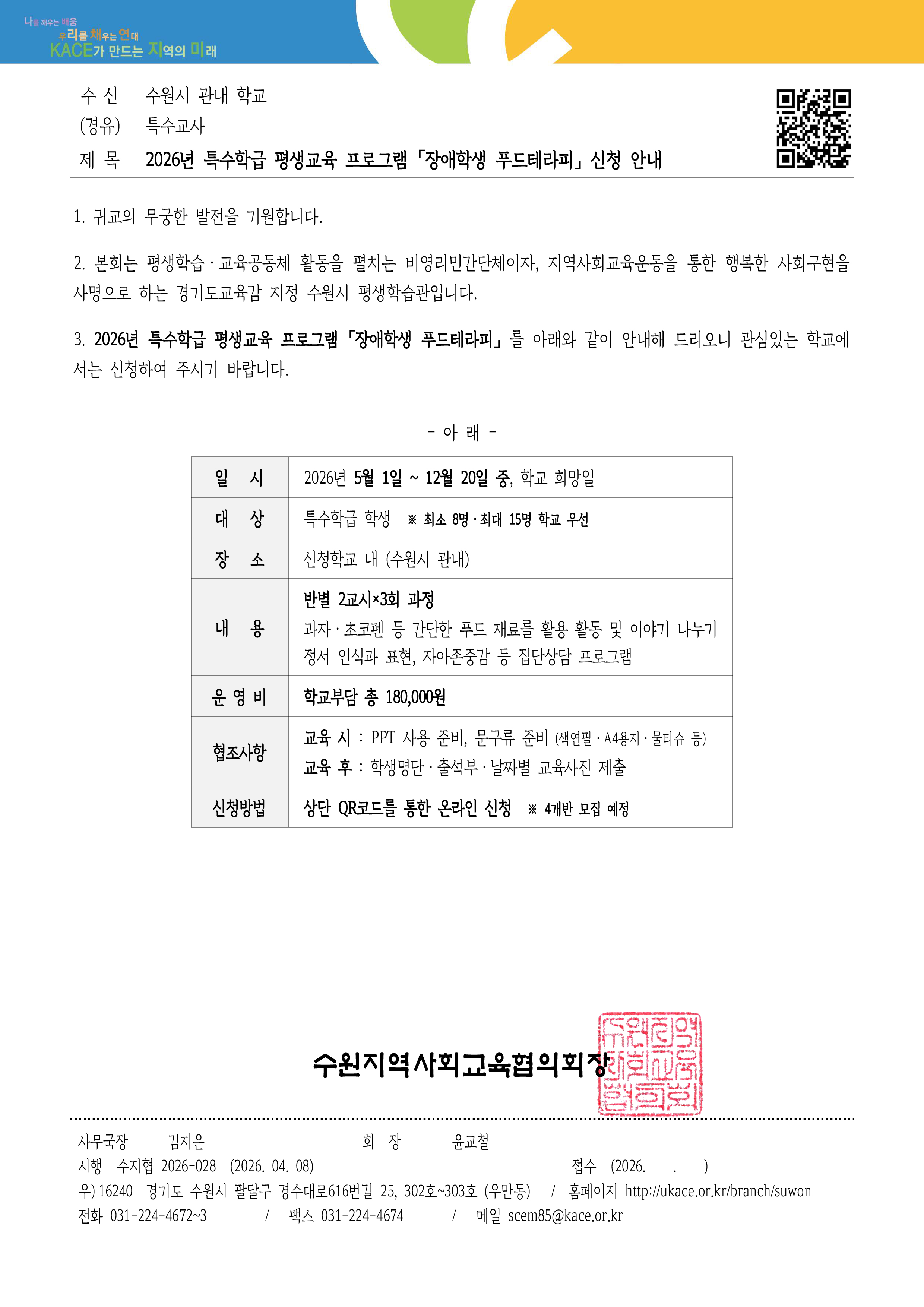 수원 청소년 워크숍 접수중 [학교] 특수학급 푸드테라피 접수기간 2026.04.08 ~ 2026.05.31 모집인원 40명 신청하기 * 프로그램 마감 시 대기 : https://forms.gle/sjaUubmoMNwNM5oQ6 첨부파일 : [공문] 특수학급 푸드테라피_1.pdf (121.92 KB)