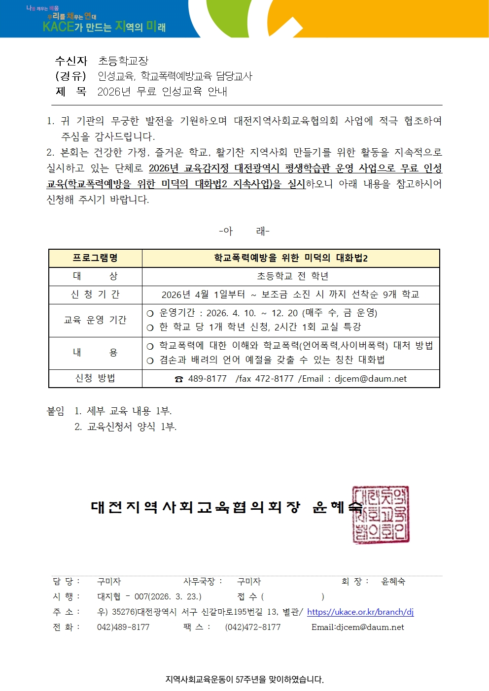 대전 청소년 접수중 2026년 초등학교 무료 인성교육 프로그램 안내 접수기간 2026.04.08 ~ 2026.09.30 모집인원 1000명 https://ukace.or.kr/branch/dj 첨부파일 : 2026-교육신청서 양식.hwp (94 KB)