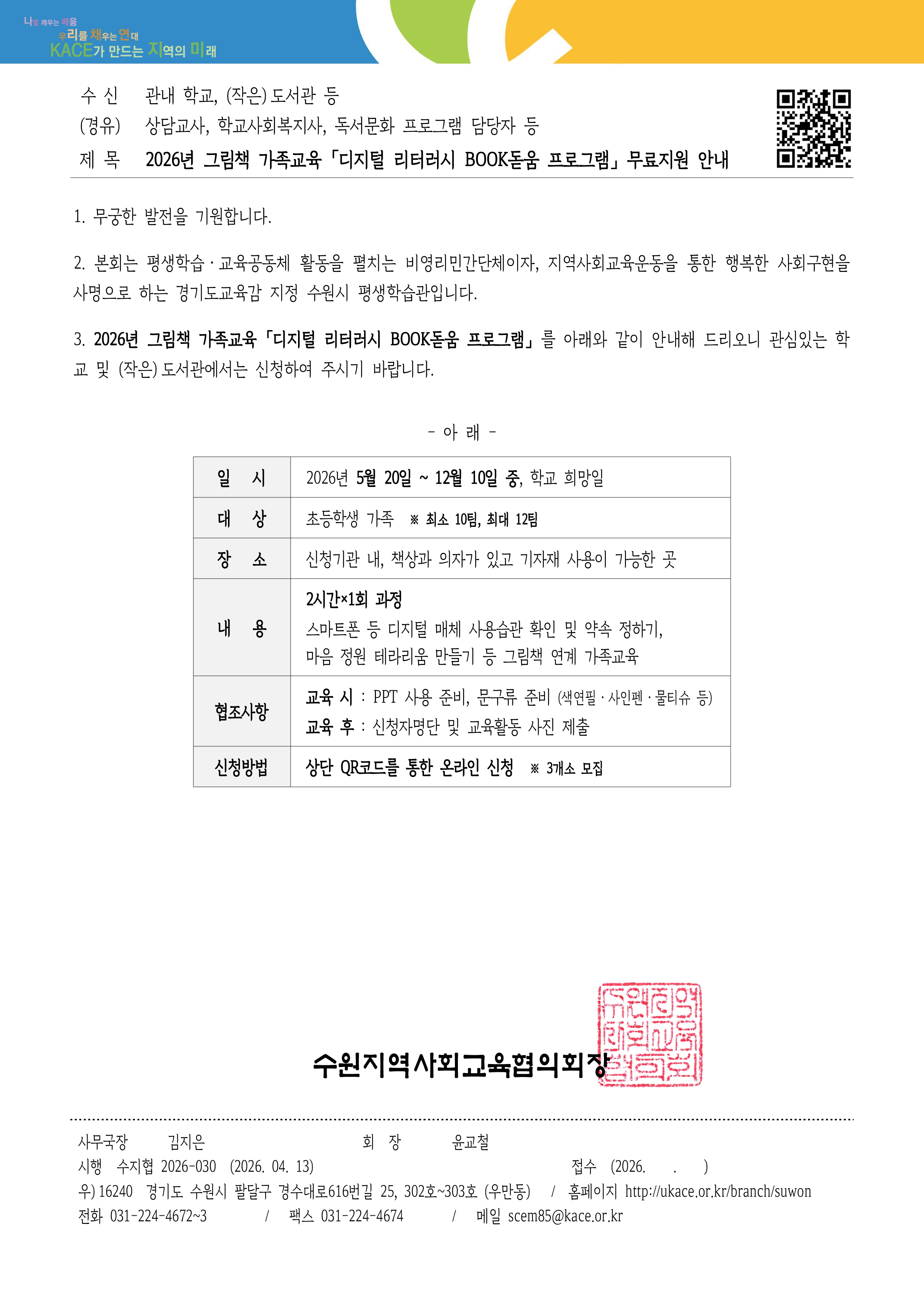 수원 부모 청소년 워크숍 접수중 [학교·기관] 가족 리터러시 접수기간 2026.04.13 ~ 2026.05.31 모집인원 50명 신청하기 * 프로그램 마감 시 대기 : https://forms.gle/sjaUubmoMNwNM5oQ6 첨부파일 : [공문] 그림책 가족교육 (디지털 리터러시).pdf (122.35 KB)