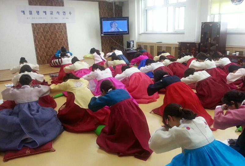 4월 26일(화) 문촌초등학교에서는 학부모 예절명예교사 대상 수업이 진행되었다. 학부모들은 이번 예절교육을 통해 자녀교육에 도움을 받을 것이며 명예교사로서 학교 학생들에게 올바른 예절지도를 할 수 있게 된다. 예절명예교사로서의 기본 소양교육과 인사예절, 우리 옷 바르게 입기와 절하기 등 꼭 필요한 수업 위주로 진행되었다.