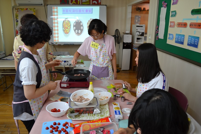 8월 19일(토) 방학동안 열심히 참여한 꿈의학교 '심심풀이 음식놀이터' 친구들의 수료식이 있었다. 이날은 그간 배운 음식 방법을 학생들이 나름 총동원해서 조별로 창의적인 음식을 하고 종강파티로 마무리했다. 카나페, 케이크, 떡볶이로 음식을 정하고 재료선정과 손질, 음식만들기까지 모든 과정을 학생 스스로가 기획하고 만들어냈다. 멋진 음식을 다하고 학생들은 함께 수료식 파티로 음식을 나누어먹으면서 훈훈하게 마무리하였다. 새학기 더 성장하며 자신의 꿈을 향해 정진하리라 기대해본다.