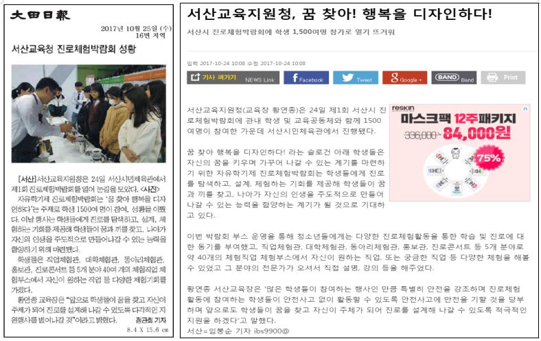 2017년 10월24일 서산시민체육관에서 ‘2017 서산시 진로박람회’가 개최되었다. 서산진로체험지원센터가 주관하고 시가 돕는 이 박람회는 중학생을 대상으로 다양한 직업을 체험해 보고 이에 대한 정보를 얻음으로써 학생 스스로 진로를 선택할 수 있는 기회의 장을 마련해주었다.