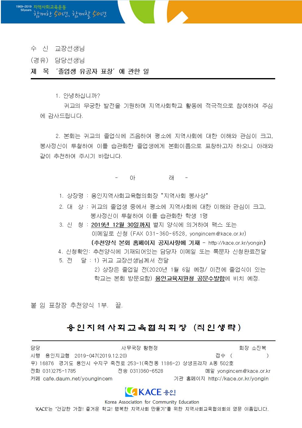 [학교 공문] 졸업생 유공자 표창장 안내 공문 및 양식 작성자 kace_yongin 등록일 2019.12.20 조회수 1786 첨부파일 : 표창장 추천양식.hwp (754.5 KB)