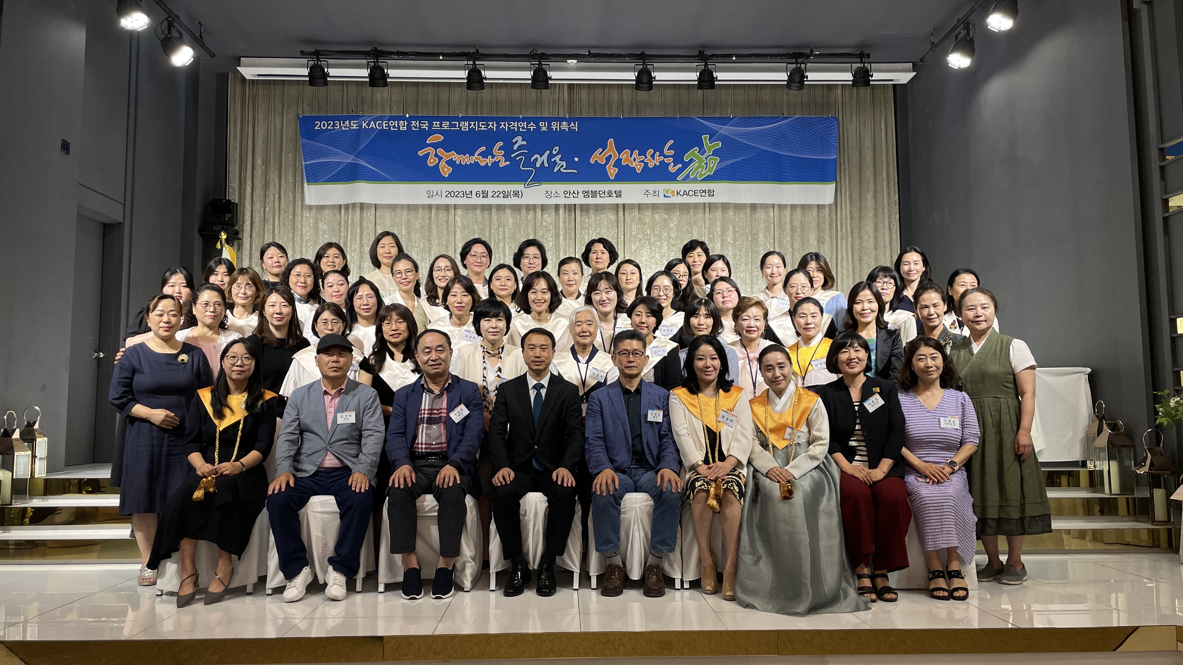 한국지역사회교육협의회연합(KACE연합)은 지난 6월 22일 안산 엠블던 호텔에서 “함께하는 즐거움·성장하는 삶(KACE연합 2023년 캐치프레이즈)”을 주제로 2023년도 자격연수 및 위촉식을 실시하였습니다. 육광심 회장님(KACE연합)과 홍승표 회장님(KACE서울)의 따뜻한 인사 말씀을 시작으로 총 2개의 강의가 이어졌습니다.