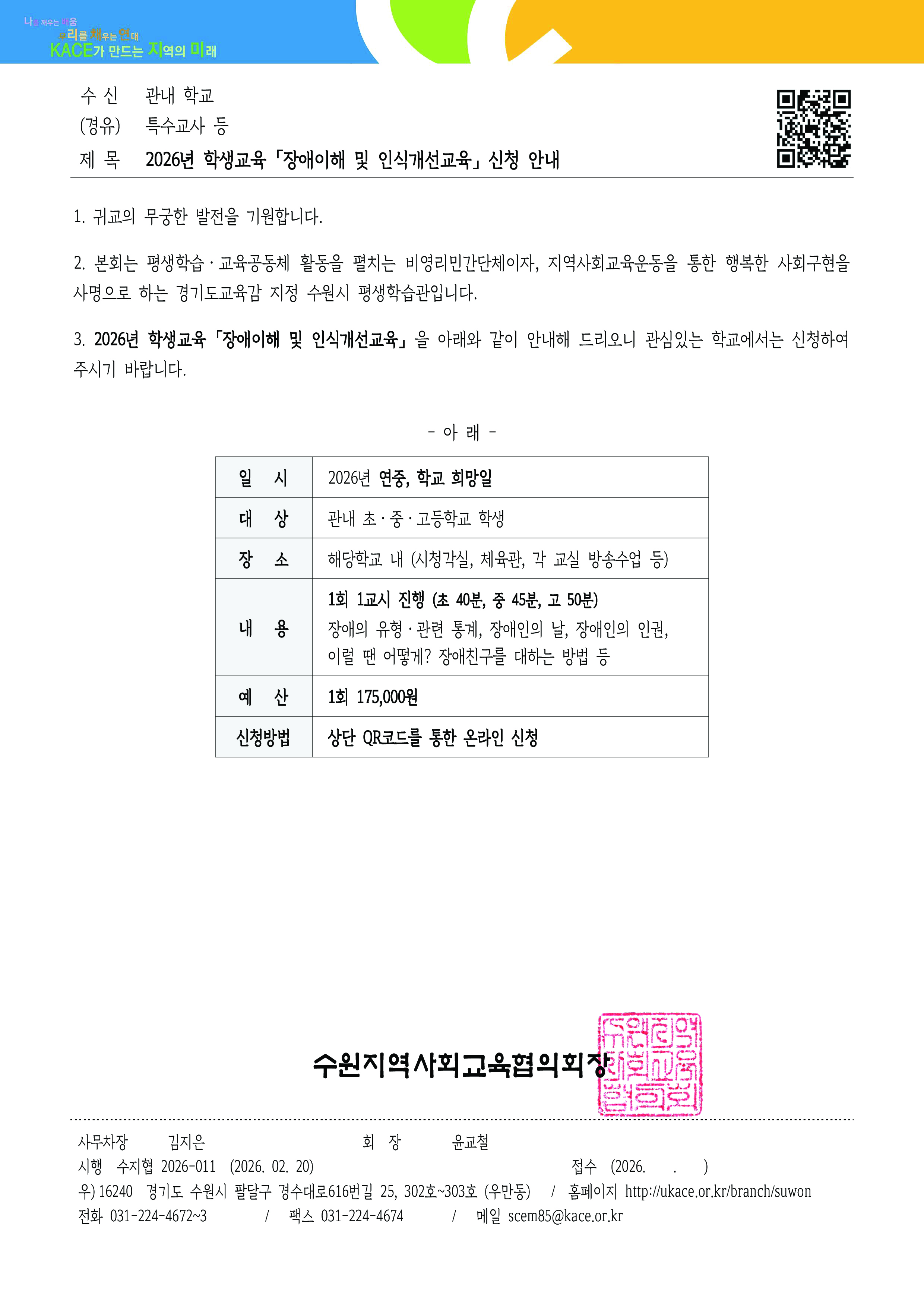 수원 청소년 접수중 [학교] 장애이해교육 접수기간 2026.02.20 ~ 2026.12.31 모집인원 500명 신청하기 첨부파일 : [공문] 학생 장애이해 및 인식개선교육 신청 안내_0.pdf (112.96 KB)
