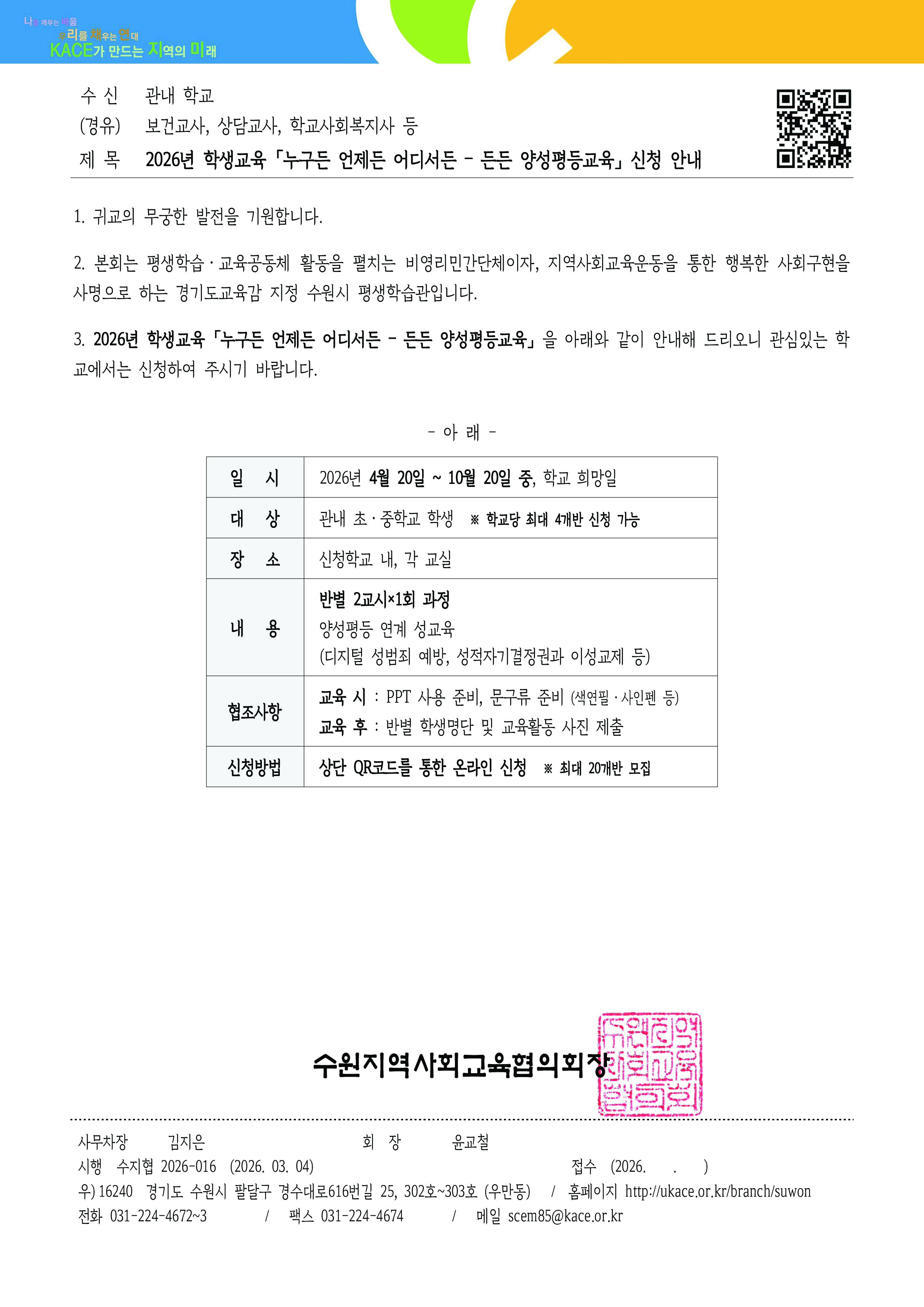 수원 청소년 워크숍 접수중 [학교] 학생 양성평등 성교육 접수기간 2026.03.04 ~ 2026.09.30 모집인원 350명 신청하기 첨부파일 : [공문] 학생 양성평등 성교육.pdf (172.49 KB)