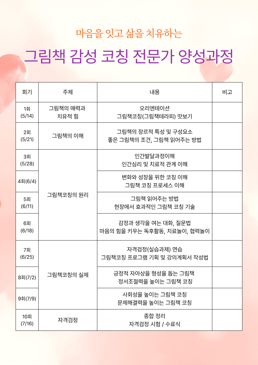 안산 성인 접수중 [참가자 모집] 마음을 잇고 삶을 치유하는_그림책 감성코칭 전문가 양성과정 접수기간 2026.04.10 ~ 2026.05.08 모집인원 20명 교육 참가신청 첨부파일 : 세부 프로그램.png (283.88 KB)